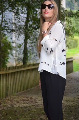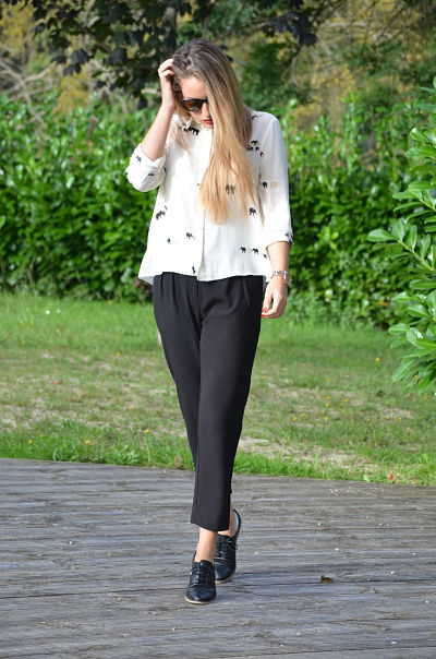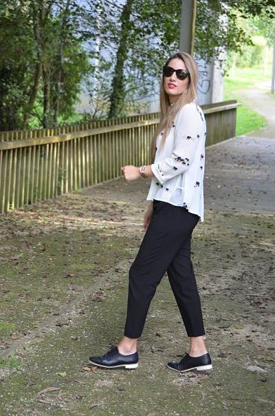 Esta formado por una camisa estampada básica, unos pantalones de estilo traje cropped y unos zapatos planos. Otra vez escogí el bolso negro mediano ya que para mi es un bolso básico para cualquier fondo de armario y para días largos me parece súper cómodo.