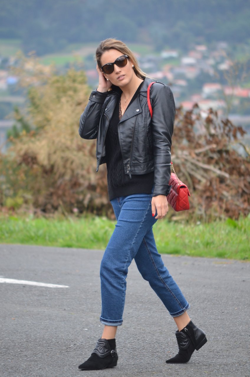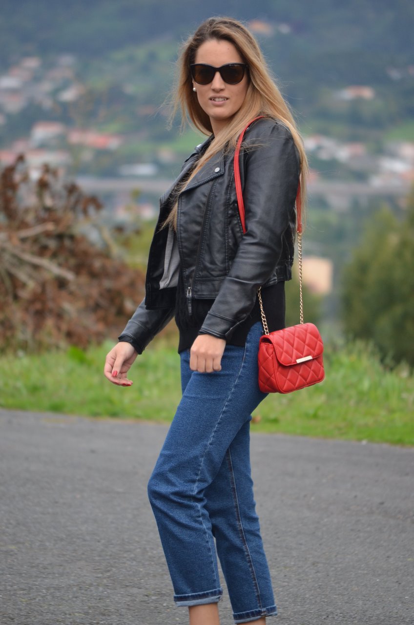 unos vaqueros de tinte azul. Para los complementos he decidido darle un punto de color con un bolso pequeño rojo y unos botines planos en negro.