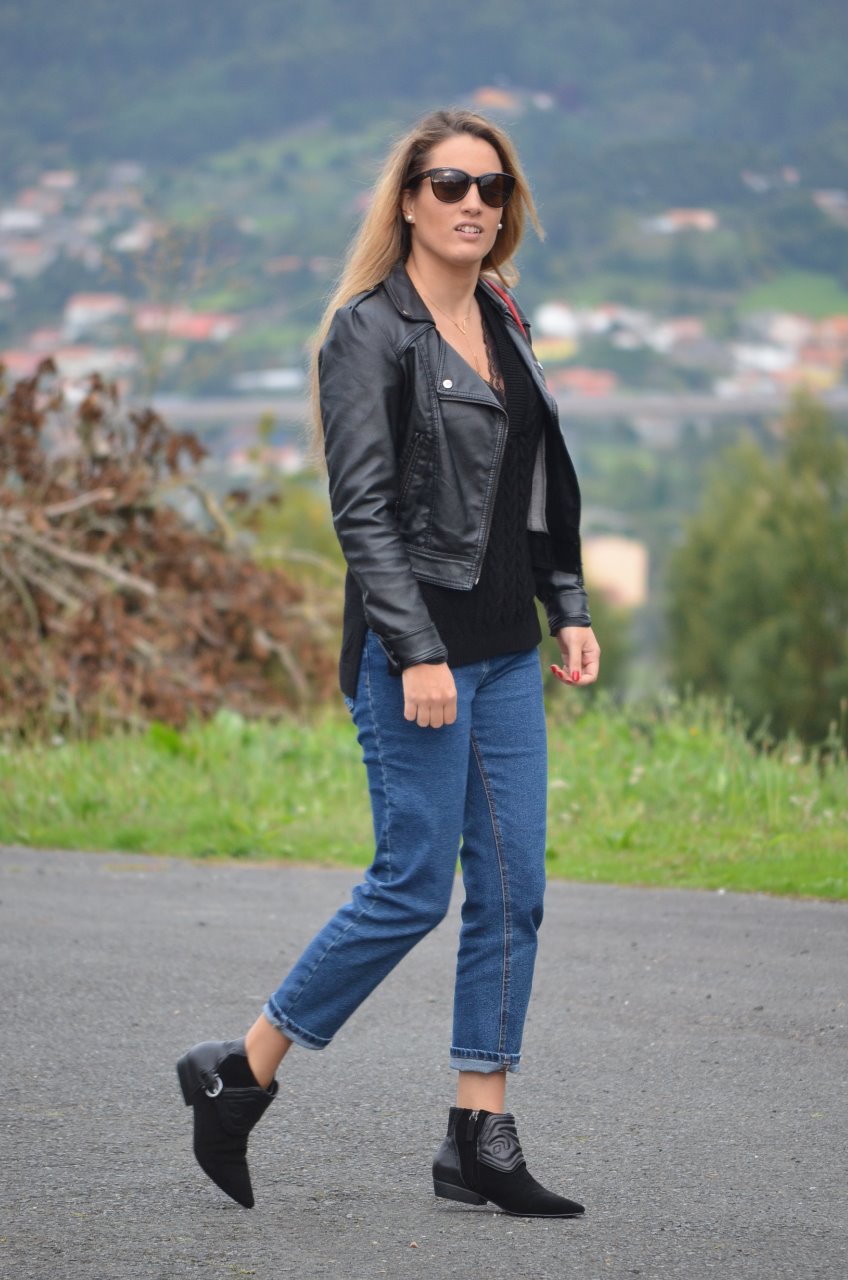 El look esta formado por una biker corta negra, un jersey de punto negro con borde de puntilla en el escote que le da el toque diferente y