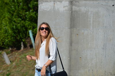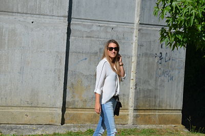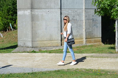 Camisa oversize blanca con raya negra(zara), vaquero bicolor(zara). Para los complementos he optado por bolso negro perforado(stradivarius) y zapatillas blancas con detalle negro(stradivarius).