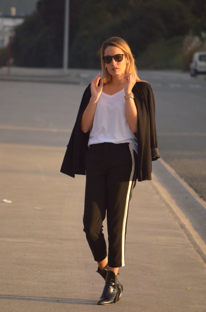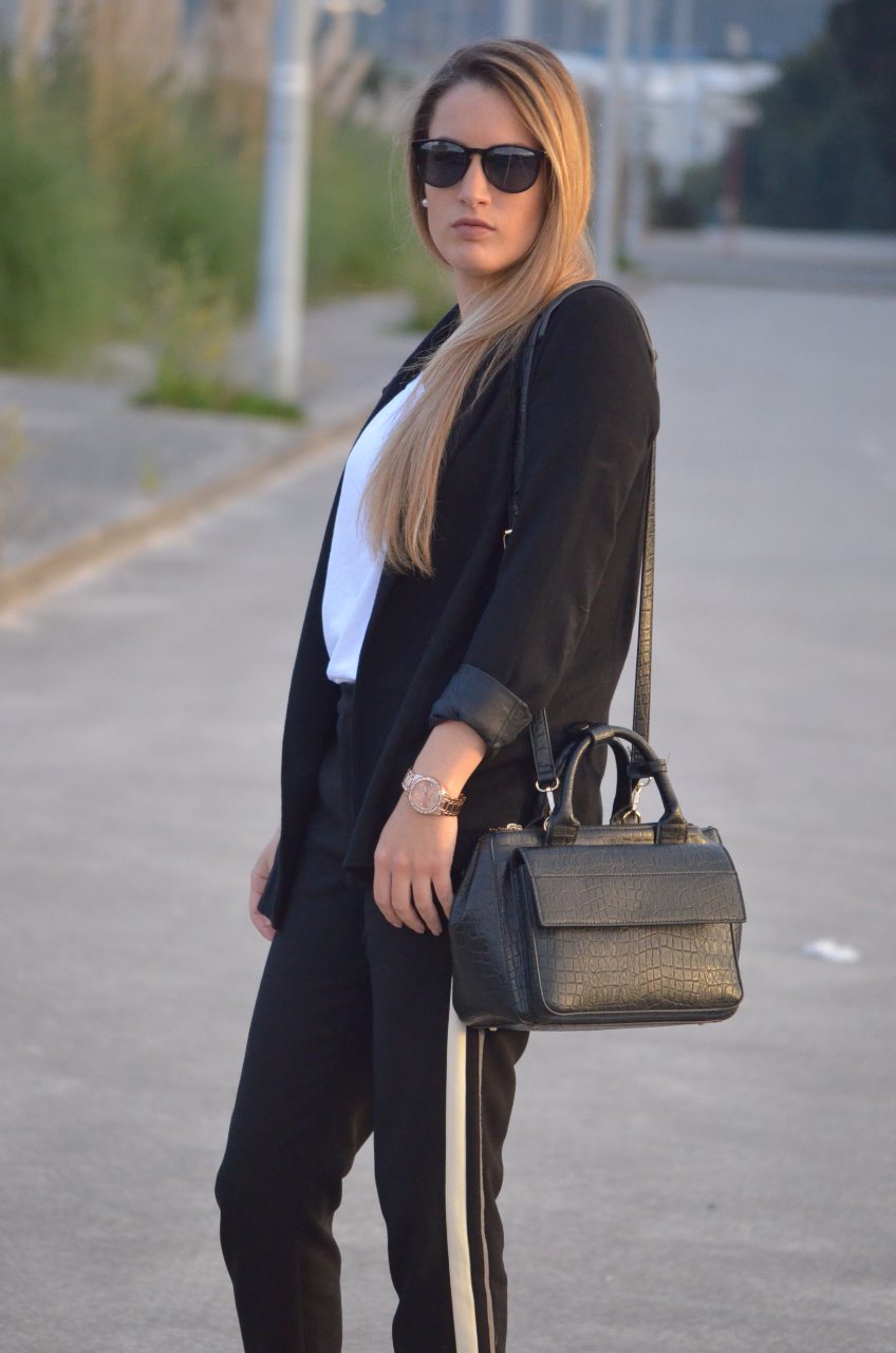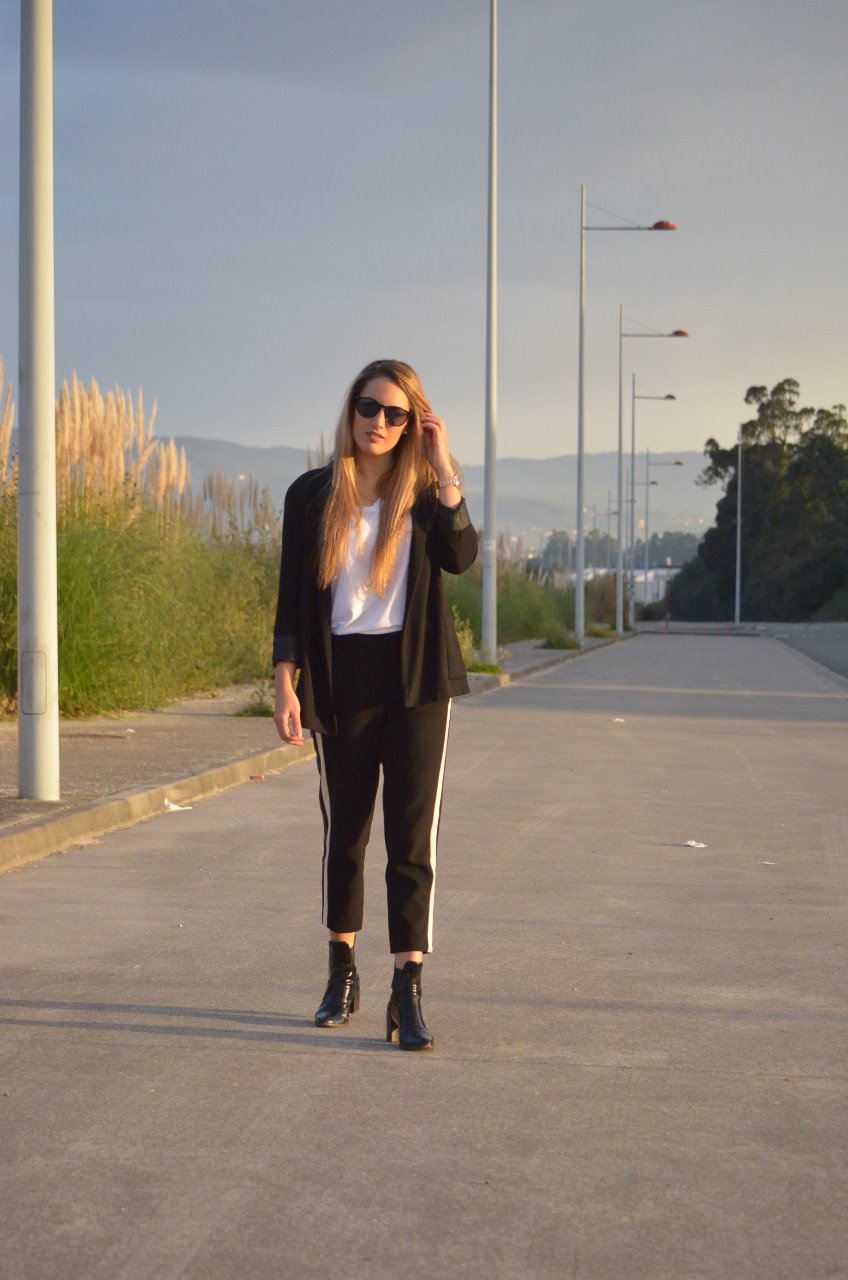 El look de hoy trae una de las tendencias que mas me gusta de esta temporada, el pantalón con raya lateral. He decidido combinarlo con prendas básicas para dejarle todo el protagonismo al pantalón. Las prendas que elegí son una blazer oversize negra, camiseta blanca, botines negros de tacón ancho y bolso mediano también negro.